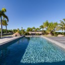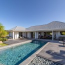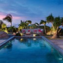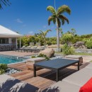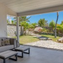 The three-bedroom villa is designed in the iconic island style and features a long stretch of swimming pool flanked on two sides by wooden sun decks furnished with oversized sun beds. At the end of the pool is a fantastic garden with a small grove of palms and an outdoor lounge comprised of a banquette ideally placed for star gazing, sunrise or sunset toasts and hours of relaxation. At the other end is the verandah attached to the villa, and it too is meant for hours of outdoor living.