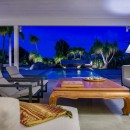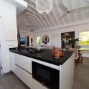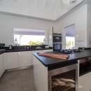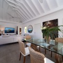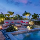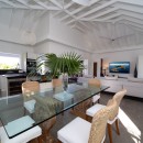 It features an al fresco dining room and a full-sized lounge. This opens indoors into the airy and bright great room. With a creamy yellow palette to coordinate with the wicker and wood furnishings, it is cheerful and welcoming. It includes a lounge that opens further indoors to the sunny living room with banquette and entertainment system. Nearby is a formal dining room area, and this leads into the gourmet kitchen. This is a wonderful space with a breakfast bar on the terrace, and premium appliances that make meal or drink prep a breeze.