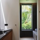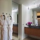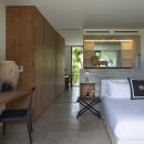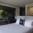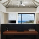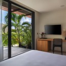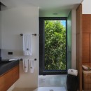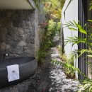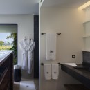 Four queen bedrooms with en-suite bathrooms are air-conditioned with ceiling fans, television, wi-fi, terraces, bathtubs, showers, vanities, water closets, safes, and views. One outdoor shower is built outdoors above the jungle canopy overlooking the hills. Another outdoor shower stands beside an outdoor bathtub made of black stone designed to look like a smooth river rock. Each bathroom is equipped with a waterfall shower head. Bedroom terraces come with chaise lounge chairs and views of the ocean.