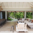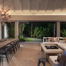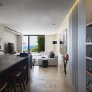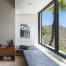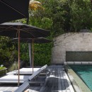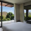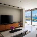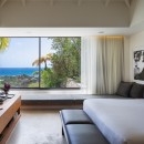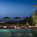 From the main living and dining space, a veranda opens onto a pool terrace. The infinity pool stretches lengthwise across the view, ending at a rock wall built into the mountainside and designed to be a fountain. Lounge chairs and parasols for sunbathing are situated on a lower level just below the pool, out of sight of the view and in possession of the same view all its own.