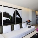 Villa Vesper is a four-bedroom villa able to sleep eight guests but outfitted to entertain more. There are two main sitting rooms. One shares the main dining room in a space that opens onto a veranda overlooking the pool, St. Bart’s exquisite green hills, and the Caribbean Sea beyond. The other main living area is beside the kitchen, also looking out over the spectacular view. Both main living spaces are subdued in design, with black cushions on teak wood in one and a sofa with a Papasan chair, coffee table, and television in the other.