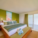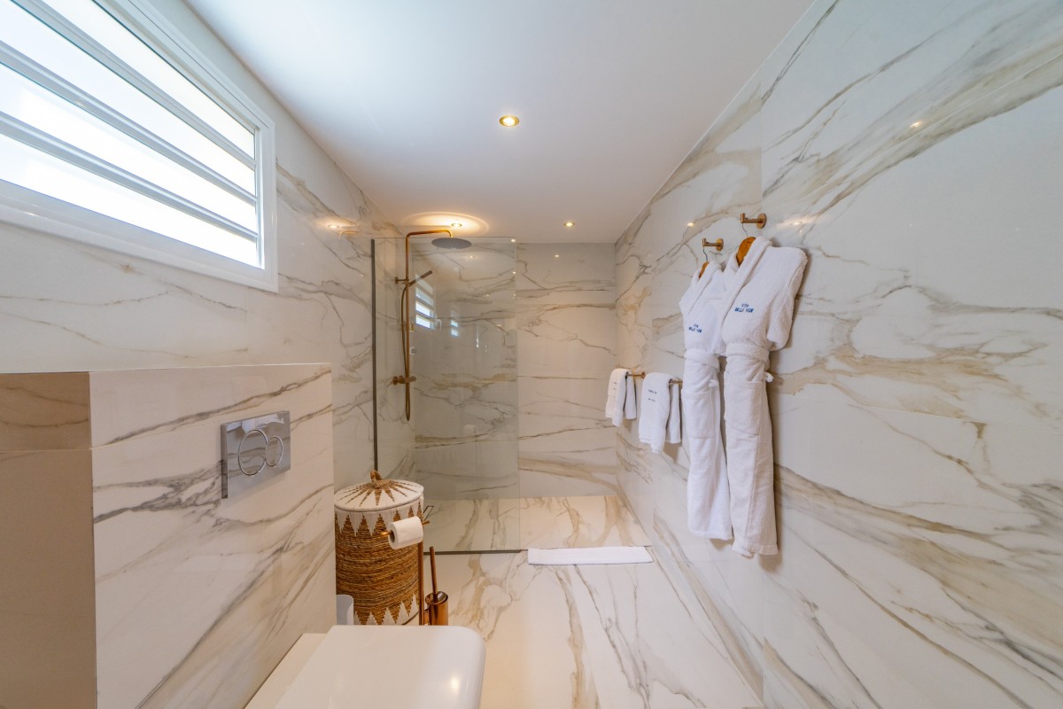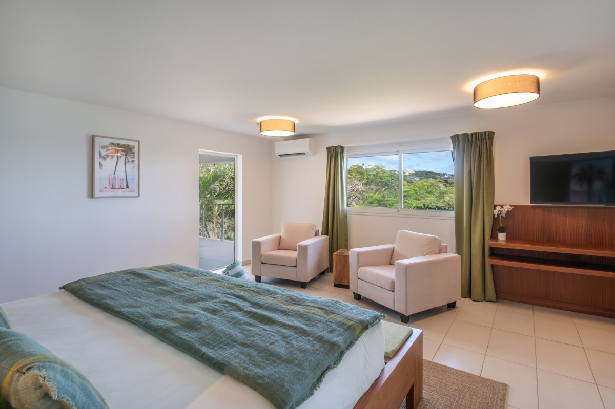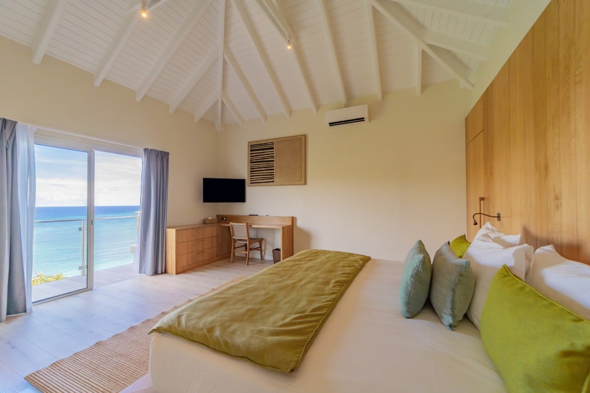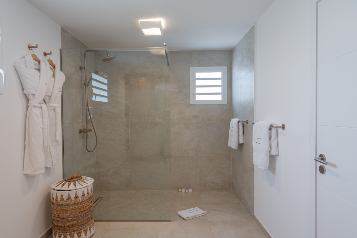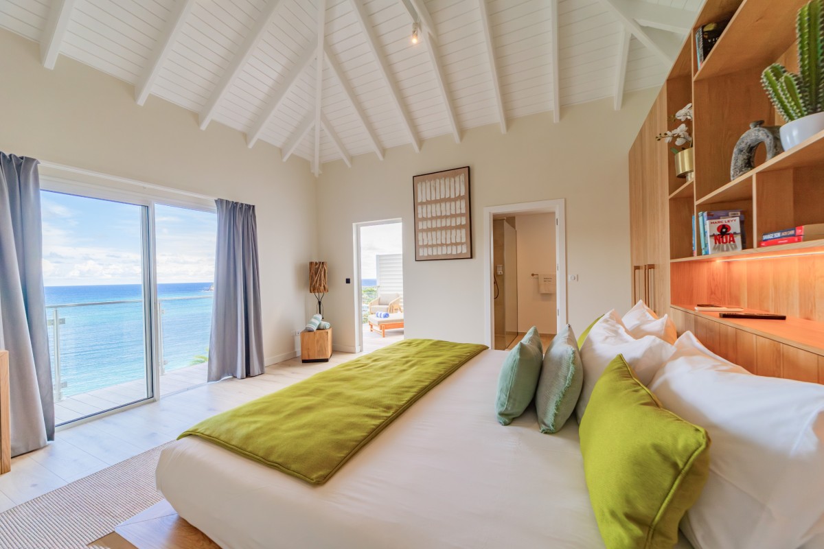 Bedroom 3: Main floor bedroom with a king-size bed, A/C, TV, safe, ocean view, private terrace, and en-suite bathroom with shower, double vanity and WC. 2 guests maximum.