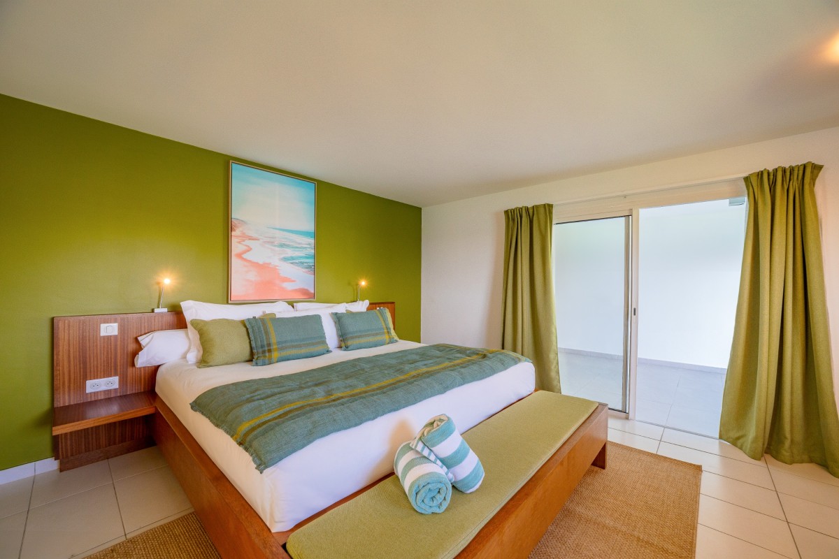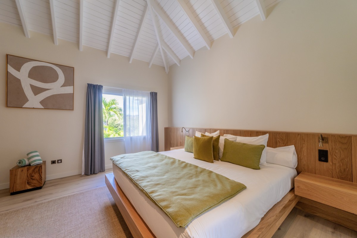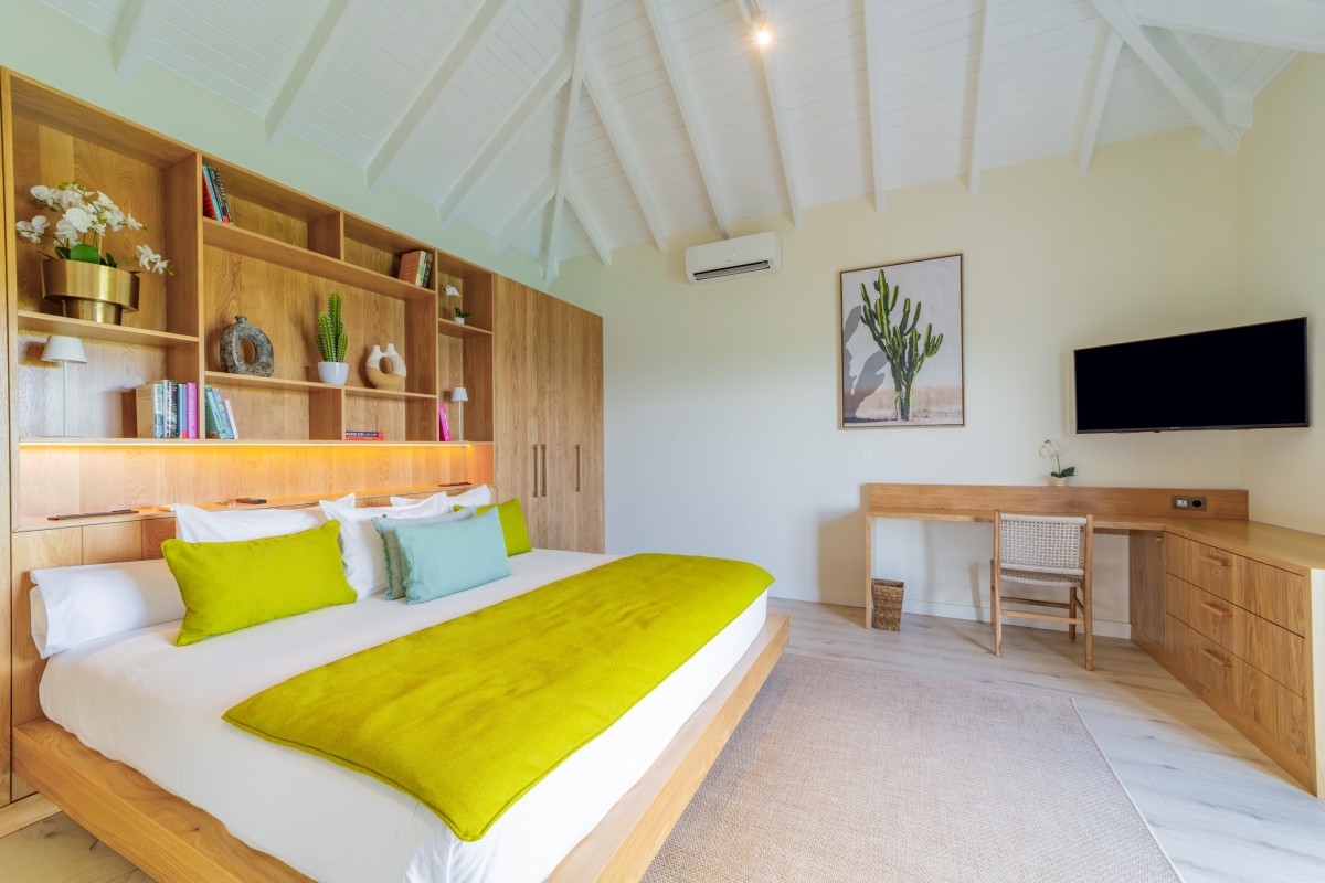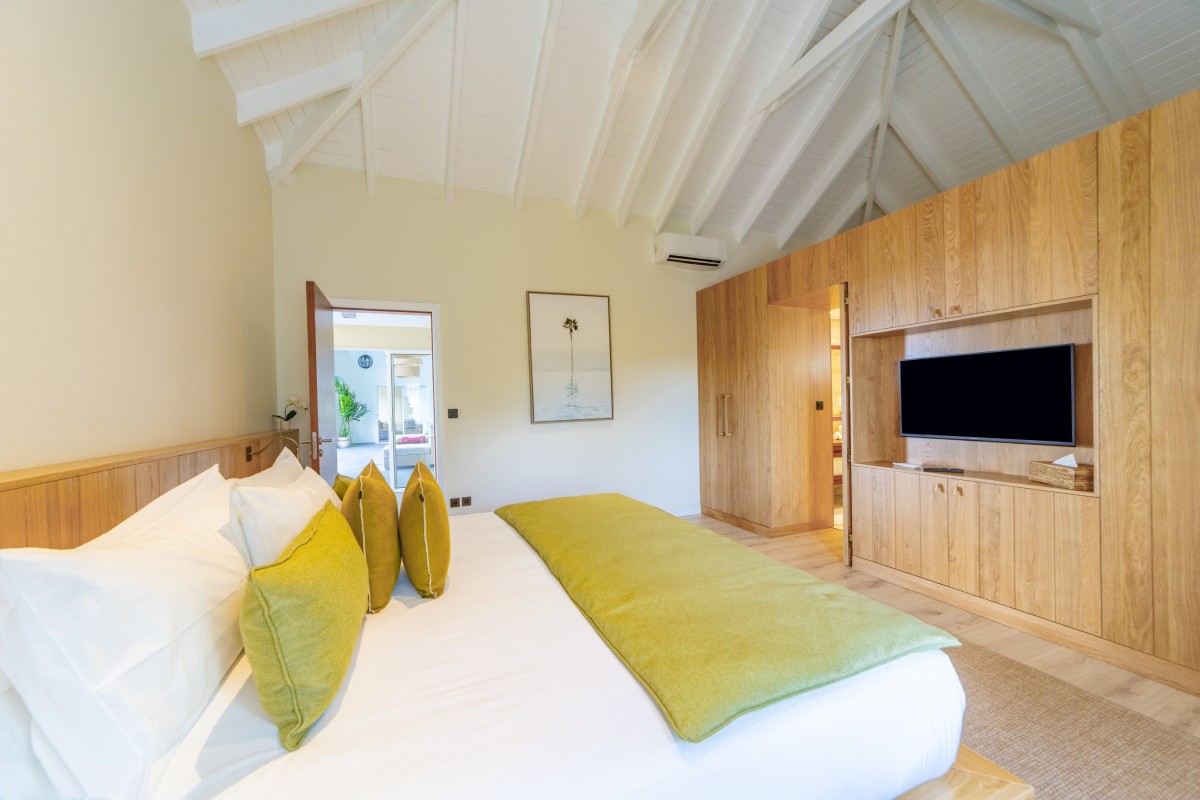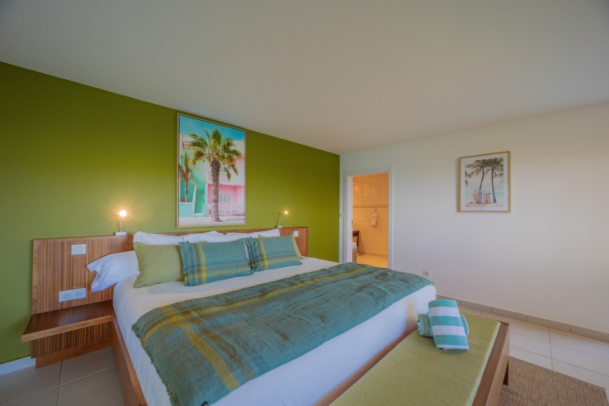 Bedroom 3: Main floor bedroom with a king-size bed, A/C, TV, safe, ocean view, private terrace, and en-suite bathroom with shower, double vanity and WC. 2 guests maximum.