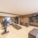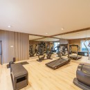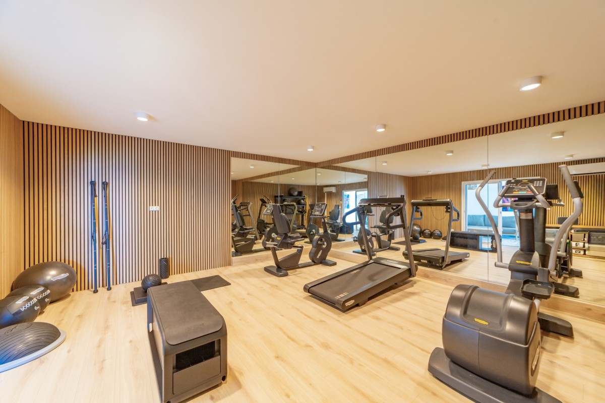 On the lower level, there is a full fitness room as well as a home theater. Two of the five bedrooms are on this level as well. The bedrooms include queen beds, premium entertainment systems, and ensuite baths. Several have private terraces, and all have great views of the sea or the gardens.