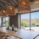Spanning two levels, the magnificent Villa La Isla welcomes guests with expansive spaces that seamlessly open onto the terrace. The exterior walls adorned with wooden cladding add a warm touch to this contemporary oasis. The living room boasts high vaulted ceilings, creating an airy and inviting atmosphere. From here, you can enjoy views of the swimming pool and relax on the comfortable sofas or gather for movie nights with the HDTV. Adjacent to the living room, a large indoor dining room accommodates up to eight guests under beautiful lighting, while the well-equipped kitchen features a spacious breakfast bar and stools. The combination of wood, soft cushions, taupe colors, and shimmering lights creates a delightful and relaxing ambiance, complemented by the stunning bay views visible through the expansive bay windows.
