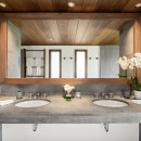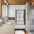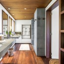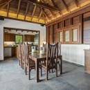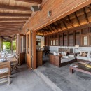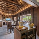 The first bungalow serves as a cozy TV lounge that opens to the dining area and a fully-equipped open kitchen. With its high ceilings, the space feels open and airy, and it can extend to the covered outdoor terrace, where a second dining table awaits. In the evening, soft lighting creates a welcoming ambiance, perfect for enjoying special moments with loved ones.