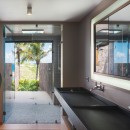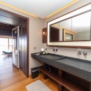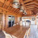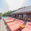 The expansive pool terrace is one of the best elements of the property. It runs the entire length of the main villa and features a lovely infinity-edge pool flanked on one end by a large and comfortably furnished sun deck. The Balinese design influences are easily detectable here, as the covered verandah is stained a rich, mahogany hue and furnished in a clean and contemporary style. Accented with oversized, artisan pottery, it offers up an al fresco kitchen and dining area as well as an enormous lounge area with multiple sofas and armchairs to make every moment comfortable and scenic.