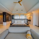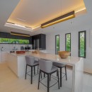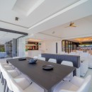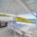 The front terrace is a stunning outdoor haven, bathed in sunlight and facing the sea. The inviting swimming pool features a shallow lounging area, while a series of sun decks provide the perfect spots for sunbathing and soaking in the view. A charming gazebo to the side of the villa houses an alfresco dining space with a barbecue—an ideal setting for sunset dinners in the tropical breeze. Nearby, a covered outdoor lounge offers a peaceful space to unwind with a drink in hand.
