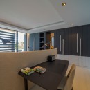 Built across three levels, Villa Turtle is designed to make the most of its breathtaking surroundings. The main level features a spacious, sunlit living room with crisp white sofas and armchairs, creating a bright and serene atmosphere. A stylish dining area sits behind a wide bay window that opens onto the terrace, offering ocean and hillside views. The fully equipped kitchen, located just behind the living area, includes a cozy dining nook—ideal for casual conversations over morning coffee.
