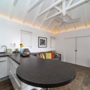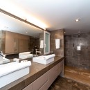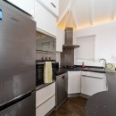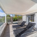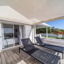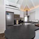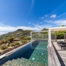 A comfortable contemporary living room features a glass wall that opens to the wrap-around outdoor terrace. The sleek black and white kitchen provides stainless steel appliances and a convenient breakfast bar. The bedroom has beautiful views, a king sized bed, air-conditioning and an ensuite bath with a shower.