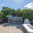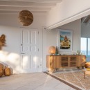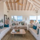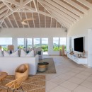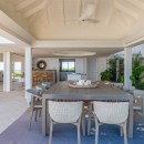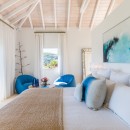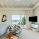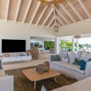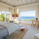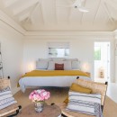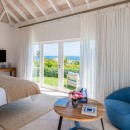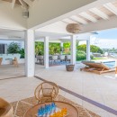 Bright and airy, Villa Poppy is designed in a sleek, modern style, where wide bay windows flood the interiors with natural light. The whitewashed walls and ceilings amplify the villa’s sense of openness, while the refined decor, with hints of wicker and soft, neutral tones, creates a serene and elegant atmosphere. The inviting living room is furnished with plush sofas and is caressed by the gentle island breeze. The fully equipped kitchen is ideal for preparing meals to enjoy alfresco under the covered terrace, where an outdoor living area offers shaded comfort with sweeping views.