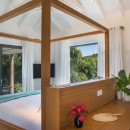 The bedrooms are each housed in individual bungalows. The master suite features a queen bed swathed in netting, an ensuite bath and outdoor shower, an office space, entertainment system and mini fridge. Two bedrooms share a large bungalow and feature queen beds, ensuite baths with outdoor showers, premium entertainment systems and mini fridges. There is another shared bungalow with three remaining suites, and all have views or terraces.