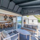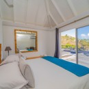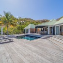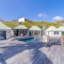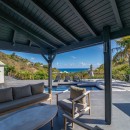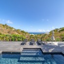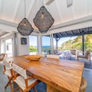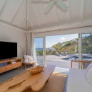 Outside, a spacious teak deck invites you to unwind by the beautiful swimming pool or lounge in the sun under the shade of a cream-colored umbrella. Enjoy panoramic views of the ocean and surrounding hills, while a covered outdoor lounge provides the perfect breezy spot to relax as time gently slows to the island’s rhythm.