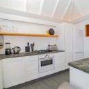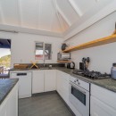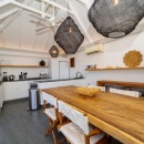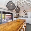 Step into a chic, ethnic-inspired interior where the open-plan living area welcomes you with a plush sofa and coffee table, all facing a sun-drenched terrace and offering captivating views of the lush natural surroundings. Adjacent to the living space, the dining area features a striking solid wood table set beneath a white vaulted ceiling, adding both volume and character. The nearby kitchen is fully equipped and thoughtfully designed for preparing gourmet meals, set within a calming palette of natural materials and earthy tones.