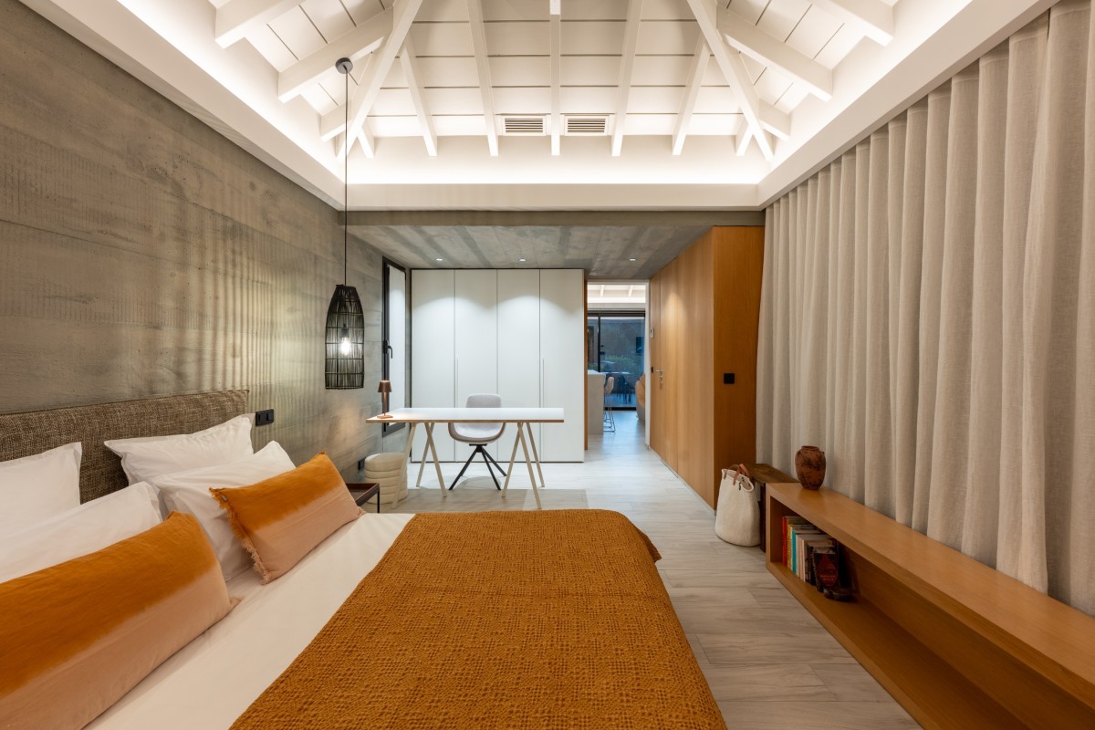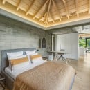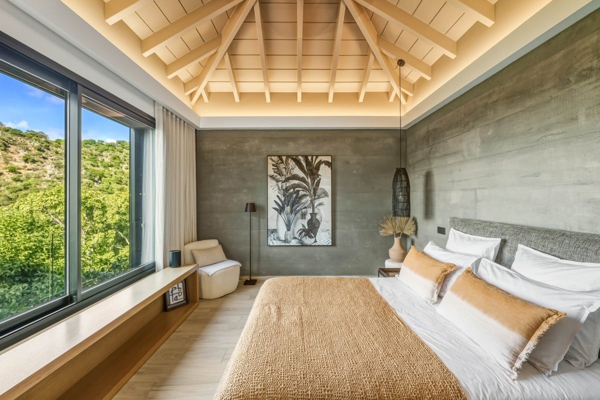 The bedroom is a peaceful sanctuary designed for rest and relaxation. It features a comfortable queen-size bed, air conditioning, a spacious dressing room, and a programmable safe for your valuables. The adjoining bathroom includes a walk-in shower, hair dryer, soft bath towels, and beach towels, ensuring comfort and convenience throughout your stay.