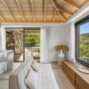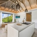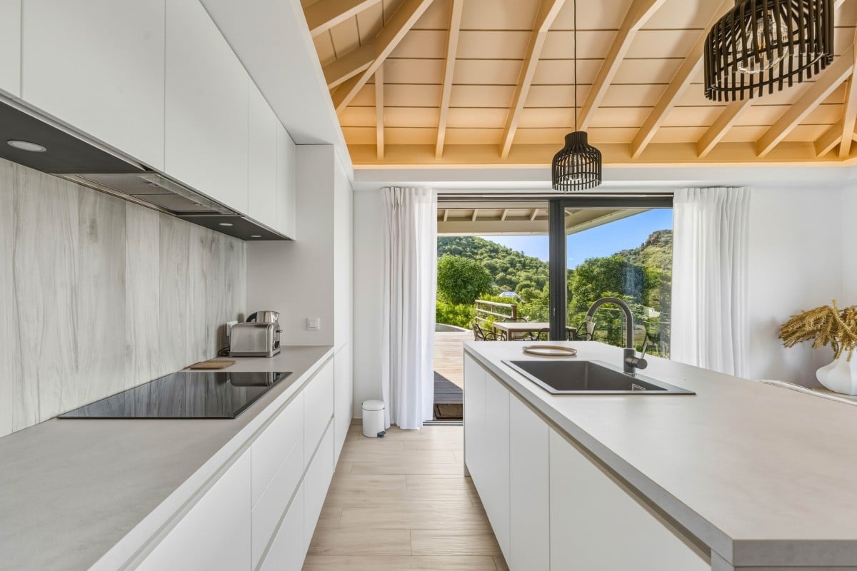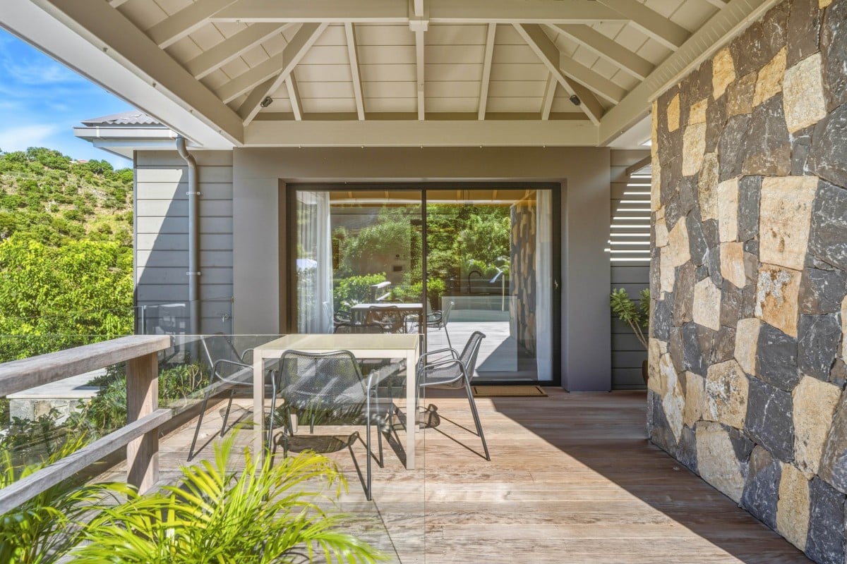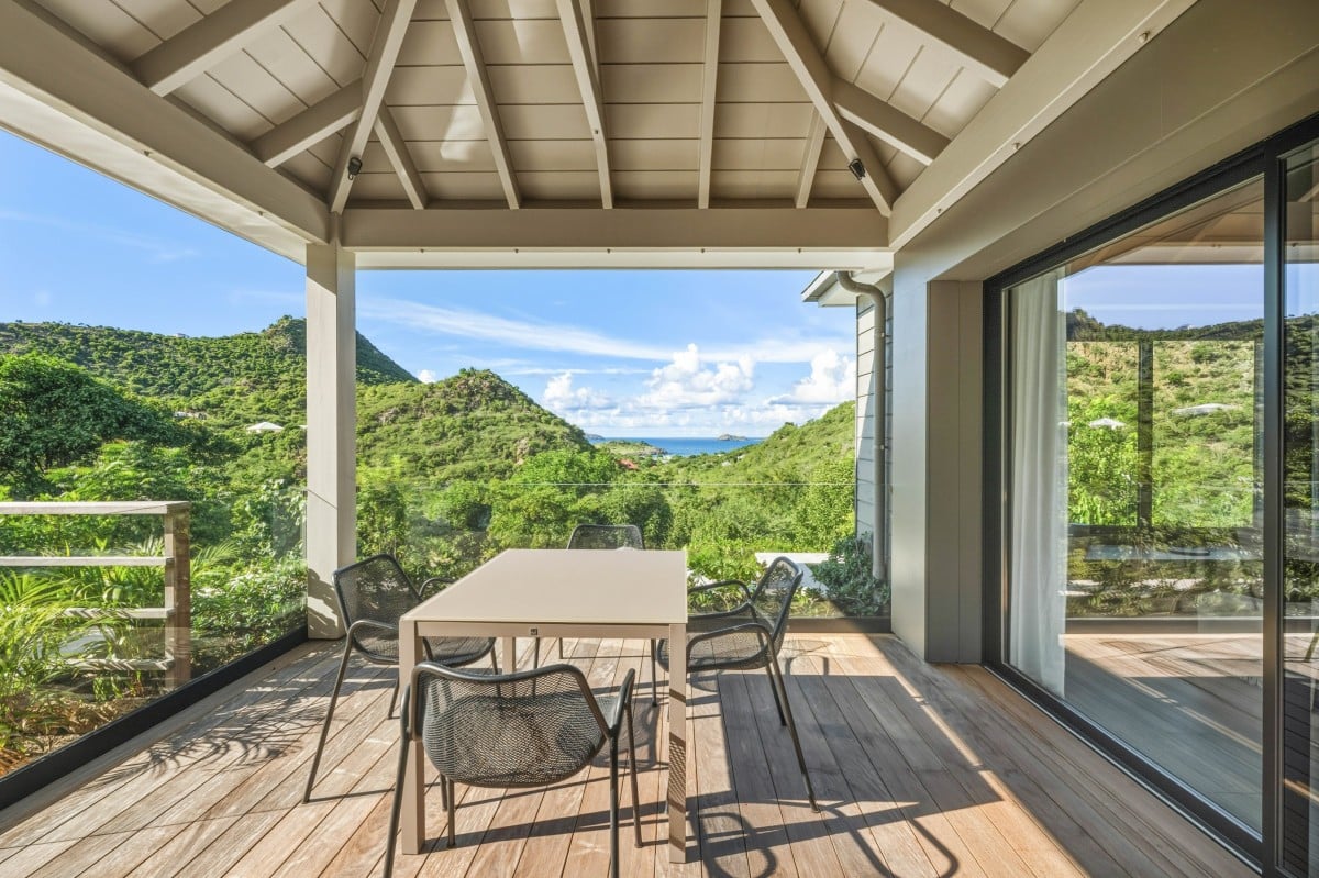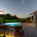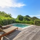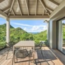 Outdoors, Villa Clémence truly shines. The private pool is surrounded by an expansive terrace furnished with sun loungers and deck chairs, perfect for soaking up the Caribbean sun or enjoying a refreshing swim. A comfortable lounge area faces the scenic view, offering the ideal spot for morning coffee or sunset cocktails. An outdoor shower adds a refreshing touch after a swim or a day at the beach.