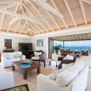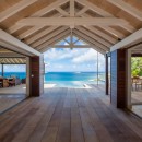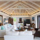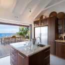 The outdoor spaces open into interior spaces. One is the remarkable, open-air living room. With its terrazzo floors and high, white-washed ceilings it captures the light and breezes. The décor is island chic and uses mahogany stained pieces paired with white upholstered sofas and chairs to create a perfectly balanced, sea-hued setting. This opens into another lounge with a more traditional design. Across the open foyer is the gourmet kitchen, full of high end appliances, it opens to the views as well and allows for easy and enjoyable preparation of meals or drinks.