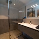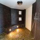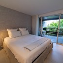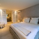 Bedroom 3: Lower floor bedroom with a queen-size bed, ceiling fan, A/C, TV, WiFi, safe, terrace access, and en-suite bathroom with shower, vanity and WC. 2 guests maximum.