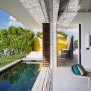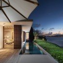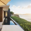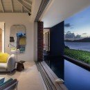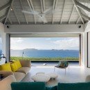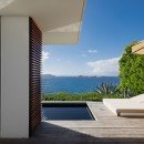 The villa sits atop a ridge and looks out towards the sea. The views are truly breathtaking, and the design of the villa only enhances them. Framing the hills and islands in the distance, the floor to ceiling windows look out on the infinity edge swimming pool and the wooden terrace too.