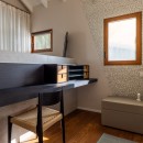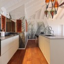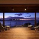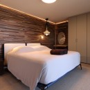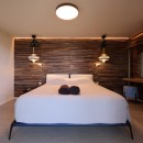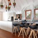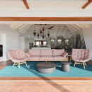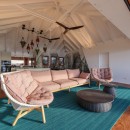 The main room in Manava is arranged on a stately wooden floor with deep, rich colors. This offsets an off-white sectional and ottoman with light wooden bases around a thin-planed, square, but otherwise featureless white coffee table. The dining table along the far wall, on the other hand, is rich dark wood with a light trim to match the living room decor and sits eight at exquisitely fine black chairs. Two halved tree rounds face one another on either side of the long plane of the dining room table to hold it up. The effect of these rich, bold pieces in light of the white vaulted ceiling and the largess of the bay in the background offers a sense of quiet retreat.