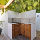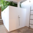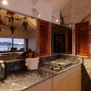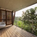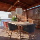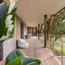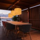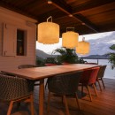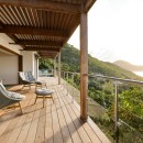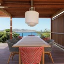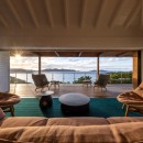 Outside, a patio set for four sits two on either side of a low table on the veranda. The veranda is shaded by closely aligned wooden planks emitting dappled daylight onto the porch-swinging chair beside the patio set. A little further on down the veranda is the outdoor dining table for dinner served alfresco. Private chefs and caterers are available to prepare gourmet meals on-site. A conversation with complimentary concierges before a visit to Manava will assure an itinerary that moves seamlessly and includes everything guests desire in a hand-tailored luxury vacation.