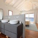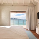 Villa Manava has four queen bedrooms and four bathrooms, en-suite. Each bedroom is decorated in its own personality. One has white vaulted ceilings that open over both the bathroom and bedroom, with the two separated by tall, white, closets with double doors on either side of the door. One bathroom has cerulean-blue tile, another bathroom has pink and beige tiles that sparkle attractively to look like sand. Each bedroom has a television with French satellite, air conditioning, a shower, bathroom, vanity, and access to the terrace with views.