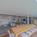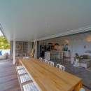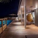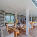 On the villa's front side, the terrace showcases a glistening swimming pool encircled by a light wooden deck. Lush palm trees create an idyllic backdrop for leisurely respites under the radiant St-Barth's sun. Below the sheltered area, an alfresco dining space comfortably seats up to ten guests, inviting them to relish delightful meals amidst the gentle sea breeze, just steps away from the outdoor lounge – the perfect spot to savor a cocktail while marveling at the stunning ocean panorama. It offers the quintessential vantage point to relish the encompassing vista and witness the resplendent St-Barths sunsets.