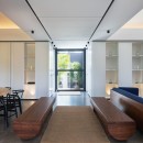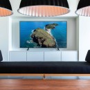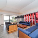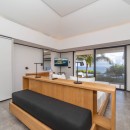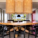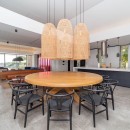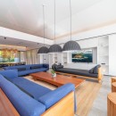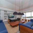 Villa Valentina is a stylish and comfortable retreat in the Caribbean, featuring large windows that open onto the terrace and ocean views. The air-conditioned living space is cozy, adorned with long benches in blue and wood tones beneath elegant hanging lights. It includes three large, comfortable sofas, perfect for conversations or movie nights. The minimalist yet sophisticated decor is ideal for entertaining. Across the corridor, the dining area features a spacious round table seating up to ten guests, perfect for intimate dinners.