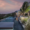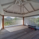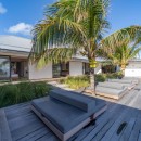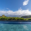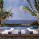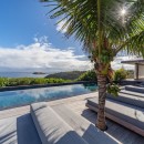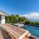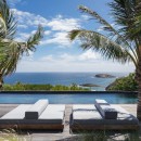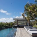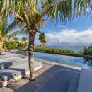 The luxurious terrace offers a tranquil setting with stunning views. An 80-foot heated granite swimming pool overlooks a breathtaking panorama, surrounded by comfortable sunbathing areas set in an idyllic scene under the Saint Barths sun, filtered through palm tree leaves. On the wooden deck, time feels suspended, gently carried by the trade winds. At one end of the deck, a large ajoupa provides a private space for yoga sessions or relaxing massages with an amazing and soothing view.
