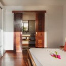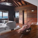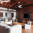 The villa's stylish design places an emphasis on rich wood architectural elements for an aesthetic that sets the tone for the enjoyment of nature. White sofas and chairs with modern styling offset the wood of the gleaming floors, furniture and walls. The spacious main living area features a vaulted ceiling with ceiling fan to augment cooling island breezes. This is the place to gather for casual conversation in front of the wide built-in flat screen TV that offers satellite reception and comes equipped with a DVD player. An indoor dining area is adjacent to the living room, and floor-to-ceiling glass doors lead to the outdoor pool.