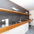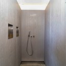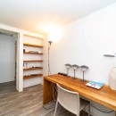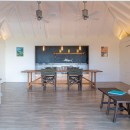 Stepping through the enormous doors into the great room, this same perfect balance of natural and man-made materials provides you with a simply elegant living room, dining room, and modern kitchen. Though basic, the kitchen is a masterful space with stainless steel surfaces balancing nicely with wooden shelves and the unique dining table nearby.