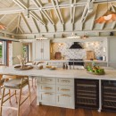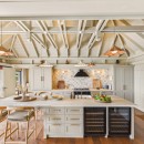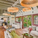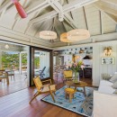 Step inside to discover bright, open-plan living spaces under soaring, beamed ceilings. The air-conditioned lounge invites you to unwind on plush seating in front of a large HD screen while sliding glass doors frame panoramic ocean views and open onto a secluded rear terrace draped in lush greenery. The adjacent gourmet kitchen, also air-conditioned, boasts a spacious central island with ample seating—perfect for casual breakfasts or intimate dinners in a relaxed, private setting. Gentle trade winds breeze through, lending a cool, airy atmosphere throughout.
