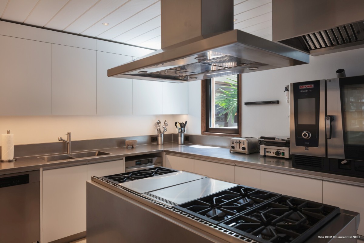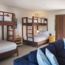 Main Level: Open-plan living and dining flow effortlessly to the terrace, with a professional kitchen for entertaining. Two ensuite bedrooms sit side by side, complemented by a children’s room with four bunk beds.