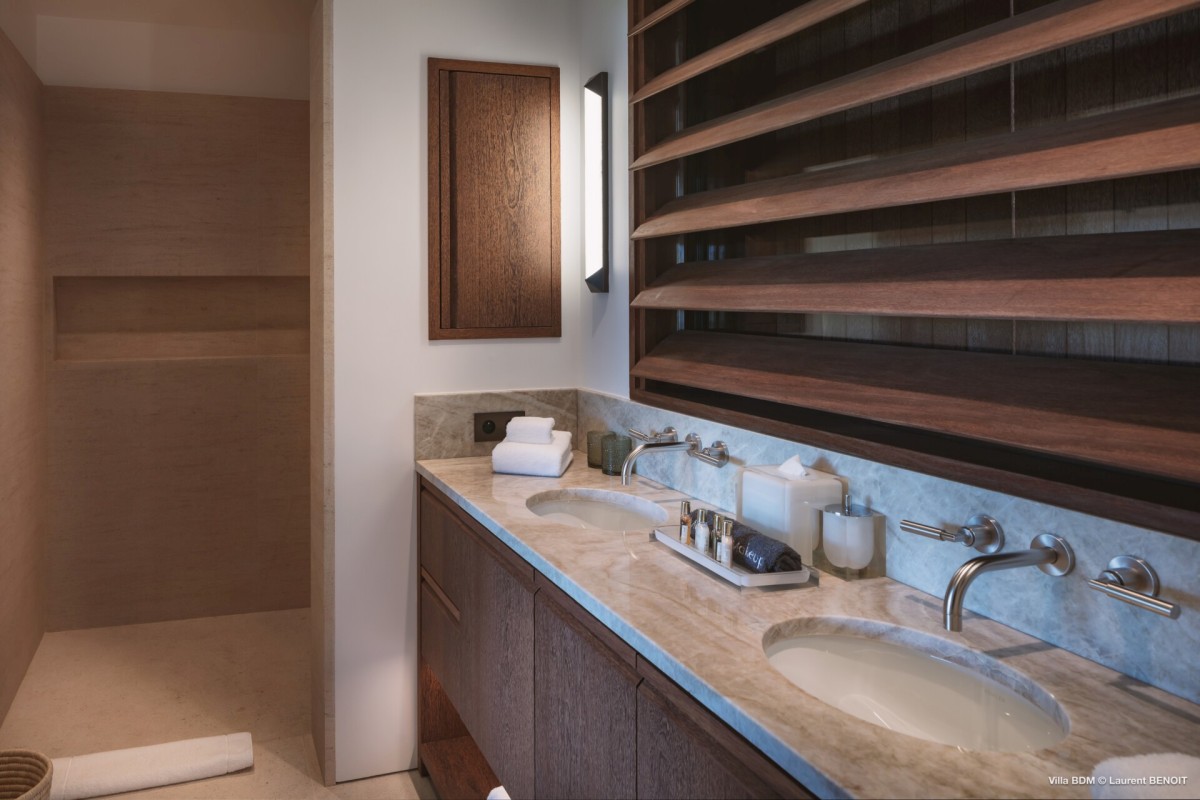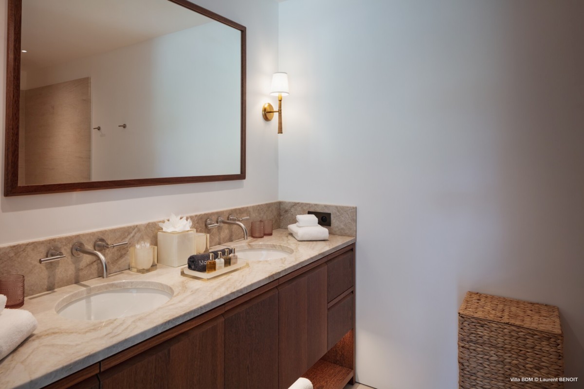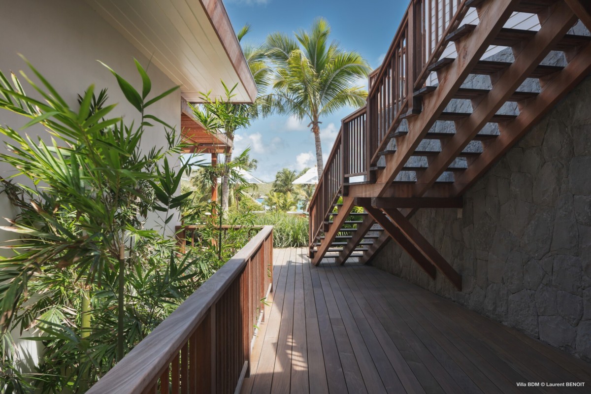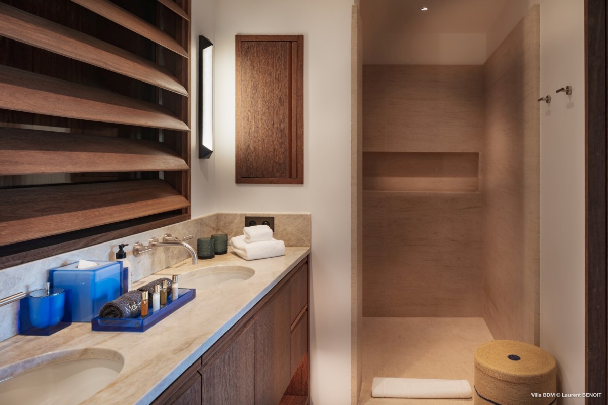 Lower Level: Two further bedrooms, one with double full beds, expand the villa’s comfort. A fitness room, massage room, and games area (pétanque, table football, ping pong) enhance the experience. From here, a private path leads directly to Little St. Jean Beach.