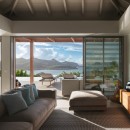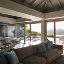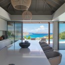 Built over two levels, Villa Jnana features expansive and air-conditioned spaces that seamlessly connect to the terrace, offering breathtaking views of the deep blue ocean. The living room is adorned with a large lounge area, complete with a comfortable sofa and bay windows that open onto the terrace, which is shaded by a lovely pergola. The soft green hues and abundant natural light create a tranquil and inviting atmosphere, perfect for relaxation and enjoyment of St. Barth's serene ambiance. The dining room comfortably accommodates up to eight guests and is situated near the well-equipped kitchen, which boasts a breakfast bar and stools, providing an ideal spot for morning coffees or snacks at any time. Within this spacious indoor area, the view of the bay and ocean is simply amazing.