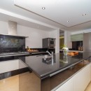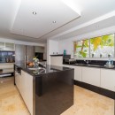 At the back of the villa is a stone wall that features a charming pond full of lilies and small, tinkling fountains. Many of the rooms open to this area as well as the sea views, blurring the lines between interior and exterior spaces. At the heart of the verandah are the shared living spaces. Enormous glass doors open to reveal the formal dining room, which opens into the impressive gourmet kitchen. Equipped with high end appliances, it is a remarkable spot to work while taking in those views. Farther along the lovely Zen-like living room is open on three sides.