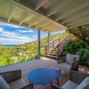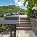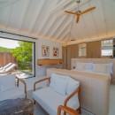 Outside, the expansive terrace overlooks the shimmering blues of St-Jean Bay. The heated infinity pool includes a shallow lounging area with submerged chaises, while additional sun loungers offer the perfect spot to unwind in the tropical breeze. Surrounded by lush palm trees and vibrant island foliage, the outdoor space is a peaceful haven that invites you to relax in complete privacy.