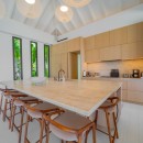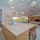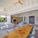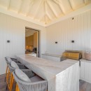 Set across three levels, Villa Seala showcases panoramic ocean views from nearly every room. On the main level, the bright and airy living room features elegant sofas and a flat-screen TV, flowing seamlessly into a fully equipped kitchen with a central island and breakfast bar. A second professional kitchen is also available for a private chef, making it ideal for catered stays. Light wood accents and bleached parquet floors enhance the villa’s refined aesthetic, while large sliding glass doors open to a shaded terrace with a dining area for ten and a barbecue - perfect for long, relaxing evenings.
