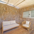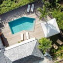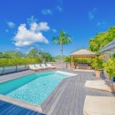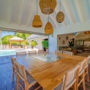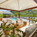 Step outside to the spacious terrace, where a large covered dining area comfortably seats eight—perfect for al fresco meals in a peaceful setting. Just beyond, the private pool sparkles in the sun, surrounded by loungers ideal for sunbathing or quiet conversation. At the far end of the pool, a charming gazebo offers a cozy outdoor lounge with a sofa and woven armchairs—an ideal spot for evening cocktails or relaxed reading sessions amid the tropical surroundings. The view over the surrounding greenery adds to the villa’s tranquil ambiance.