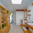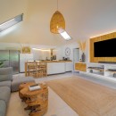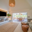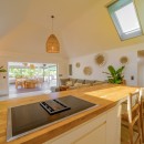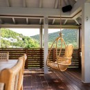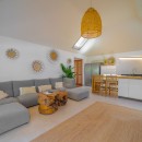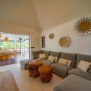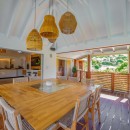 Surrounded by lush tropical vegetation, Villa Vi welcomes guests into a bright and cozy interior filled with natural light. The open-plan living room features a plush sofa with soft cushions and a large HD screen, ideal for relaxed movie nights. Adjacent to the living area is a fully equipped kitchen with a breakfast bar, illuminated by skylights in the vaulted ceiling. Accents of wood and wicker lend a warm, natural feel, while the gentle Caribbean breeze flows easily throughout the space.