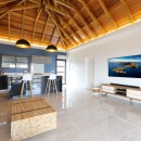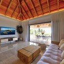 Step inside the open-plan, air-conditioned great room, where a plush sofa sits beneath a striking vaulted ceiling crafted from warm, caramel-toned wood. The atmosphere is both cozy and elegant, blending contemporary décor with island charm. At the back of the space, a sleek, fully equipped kitchen with a breakfast bar invites you to prepare delicious meals, which can be savored on the covered terrace at a large dining table for six—perfectly positioned to take in breathtaking ocean views.