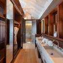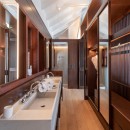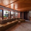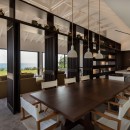The expansive terrace at the front of the villa overlooks the horizon, showcasing a heated infinity swimming pool. Sun loungers and umbrellas are strategically placed near towering palm trees, allowing the gentle ocean breeze to caress your skin. A covered terrace adjacent to the pool hosts an outdoor lounge and a spacious dining area for ten guests, inviting you to savor alfresco meals in the pleasant Caribbean air. The meticulously landscaped green lawns surrounding the dark wood buildings add a touch of poetic beauty to the contemporary design, enhancing the allure of the stunning ocean view.
