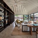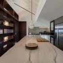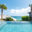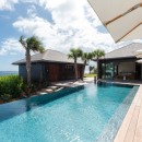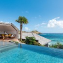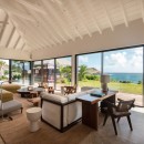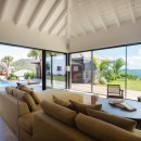 Recently constructed, the exquisite Over The Ocean villa welcomes guests to a paradise setting overlooking the ocean. The property is designed around a central swimming pool, with four independent buildings that create a harmonious and tropical oasis. The main building features a large living room adorned with comfortable sofas and armchairs, where expansive bay windows frame mesmerizing ocean vistas. At the back of the living room, a fully equipped kitchen with a dining area and room for eight guests sets the stage for delightful meals. The elegant decor showcases striking white vaulted ceilings contrasting with warm, dark wood accents, exuding a refined and inviting ambiance.