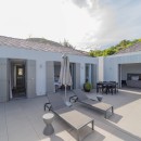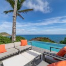 Perched gracefully upon the rugged coastline, Roc e Mar showcases a modern design, just a stone's throw away from the shimmering beach with its glistening silver sands. As you step into the air-conditioned, spacious living area, your attention is immediately captivated by the expansive bay window framing the enchanting ocean vistas. The indoor dining room, with seating for eight, seamlessly flows onto the terrace, where you can gaze upon the pool and the azure waters of St-Barths. A fully equipped kitchen awaits culinary enthusiasts, adorned with a contemporary palette of pearl gray and white, complemented by subtle bursts of color in the plush sofa cushions, creating an effortlessly chic and inviting ambiance.
