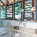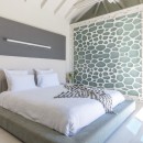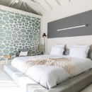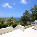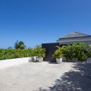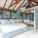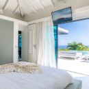 The main living space of Villa Rose Dog provides contemporary white sofa seating with a long open wall that offers unobstructed views of the sea. A soaring vaulted ceiling adds drama to the room while allowing guests to feel the cooling effect of ocean breezes. Enjoy modern electronics like TV, WiFi, Dish Network, an iPod station and a CD player. The sleek gourmet kitchen features a center island that functions as a breakfast bar, and an indoor table is ideal for a quick and easy meal. For a memorable island experience, dine al fresco on the adjacent terrace under a protected portico with gorgeous water views. Villa Rose Dog features four air-conditioned bedrooms that are a study in high style design, each with a queen bed, an ensuite bath, and a TV and DVD player. Two master bedroom suites are connected to the main living area and open to the pool deck. A third is set on a higher level in a separate bungalow for complete privacy. All three bedrooms offer magnificent ocean views. A fourth bedroom on a lower level is suitable for teens or staff.