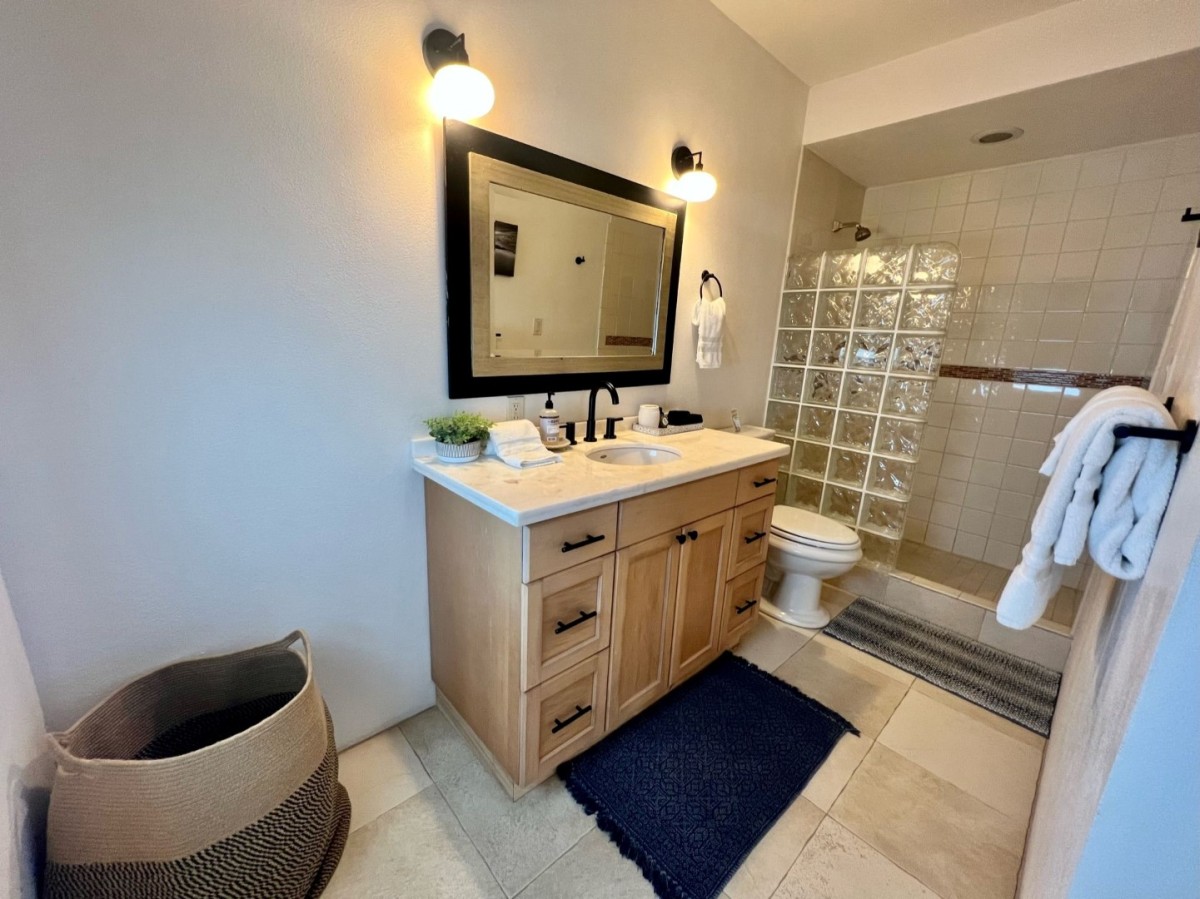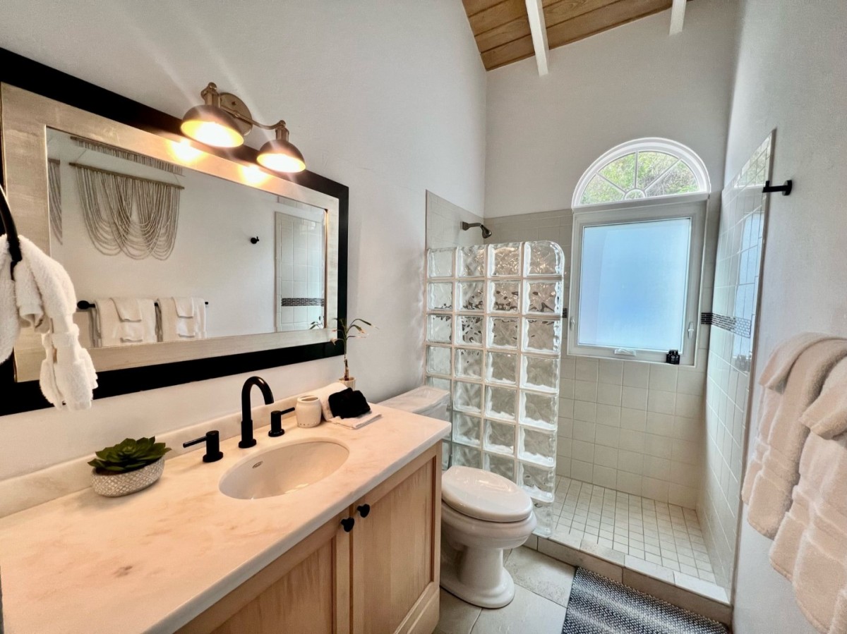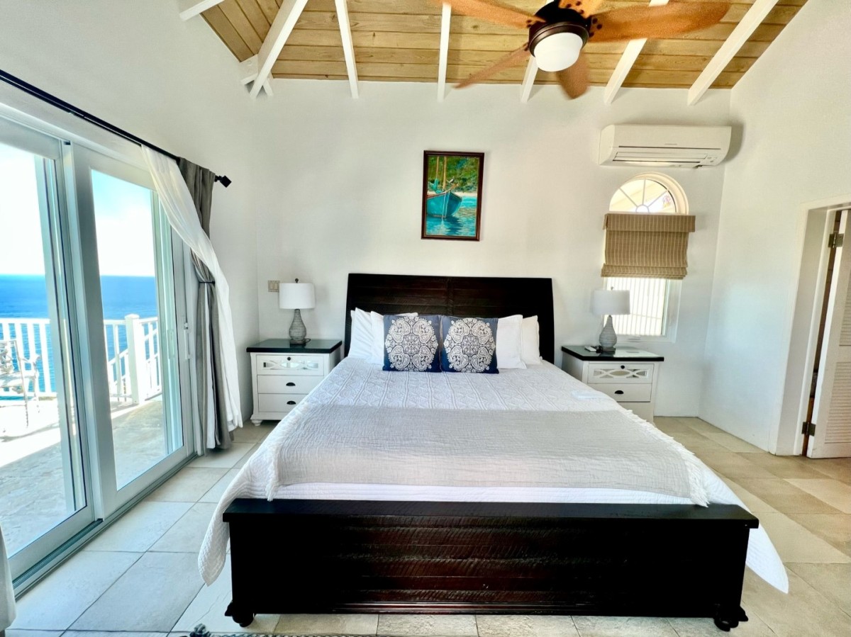 Bedroom 1: Master bedroom with a king-size bed, ceiling fan, A/C, WiFi, ocean view, access to the terrace, and en-suite bathroom with shower, vanity and WC. 2 guests maximum.