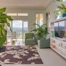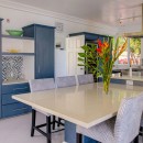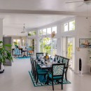 Open-plan living area furnished with chic décor and designed to flow seamlessly into the outdoor spaces..A bright and welcoming dining area with large windows framing the views, ideal for meals with family and friends.