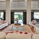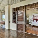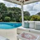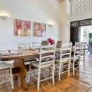 There is a long dining table which can seat 12 persons and another round table which can seat 8 persons. A wooden patio runs the entire length of the house furnished with tables and chairs for alfresco dining and sofas and loungers for relaxing. The patio is adjacent to the pool deck, swimming pool and a large wooden deck for sun worshipers. There is also an attractive gazebo with built in seating.