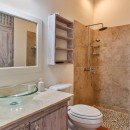 The first floor has 4 air conditioned double bedrooms. Two of these have king size beds and open onto a high level patio, where guests can enjoy wonderful views. Each of these bedrooms has an en suite shower room. The other two bedrooms have two single beds each, which can be converted into a king bed. Both bedrooms have en suite bathrooms, one with a tub and one with a shower.