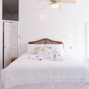 Bedroom 1: Master bedroom with a king-size bed, WiFi, A/C, and ceiling fans. TV, sea view, private balcony, and en-suite bathroom with shower, double vanity, and WC. 2 guests maximum.